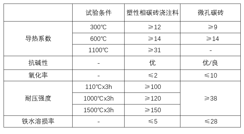塑性相碳磚澆注料不是自焙碳磚,他們完全不是一回事,他們的材料成分、施工工藝、運作機理有著巨大的差別。塑性相碳磚澆注料不需要燒成,而且它本身在常溫下有很高的導熱性能和強度。常溫(20℃)導熱系數大于10W/(m·k),耐壓強度大于30Mpa。