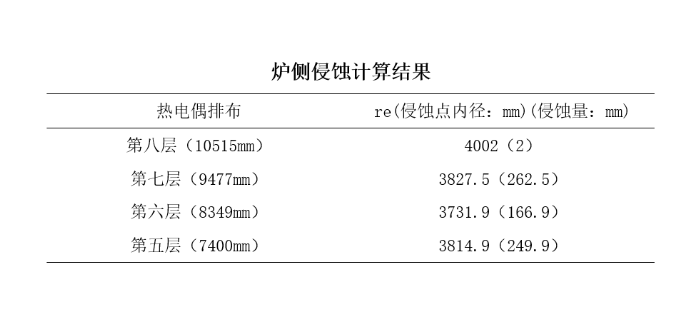 中陽鋼鐵1#高爐投產一年后,利用一維穩態導熱模型對爐底爐缸侵蝕量進行測算,結果表明:爐缸側壁侵蝕量最大為263mm,象腳區為250mm,爐底侵蝕量最大為70mm